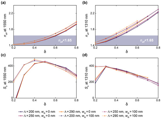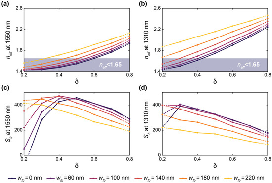 (a,b) Simulated neff versus δ for SWG waveguides with Λ = 200, 250 and 290 nm, w = 500 nm, t = 220 nm, and wfb = 0 and 100 nm, operating with (a) 1550 nm and (b) 1310 nm light. The shaded area represents the region where neff is below the substrate leakage loss cutoff of 1.65, as reported by Sarmiento-Merenguel et al. [80]. (c,d) Simulated Sb versus δ for SWG waveguides with Λ = 200, 250 and 290 nm, w = 500 nm, t = 220 nm, and wfb = 0 and 100 nm, operating with (c) 1550 nm and (d) 1310 nm light. Simulations were performed using a 3D-FDTD approach with water as the cladding material.