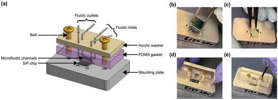 (a) Schematic and (b–e) photos of microfluidic and photonic chip assembly for fluidic testing. (b) The chip is placed on the mounting plate, (c) the chip is positioned into the machined recess of the mounting plate, (d) bolts are threaded through the bolt holes of the acrylic washer and poly(dimethylsiloxane) (PDMS) gasket and aligned to the threaded holes in the mounting plate, and (e) bolts are screwed into place to align and seal the fluidics against the photonic chip.