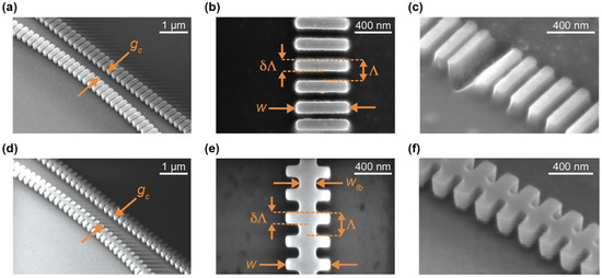 A Zeiss Sigma scanning electron microscope (SEM, Carl Zeiss AG, Jena, Germany) was used to image the fabricated photonic chips. Imaging was carried out to compare the designed dimensions to the fabricated structures and identify any fabrication limitations or unexpected effects. In-lens and secondary electron detectors were used to take top-view and angled-view (45° tilt) images of the photonic devices. ImageJ was used to measure the dimensions of the fabricated SWG waveguides on top-view SEM images taken at 50,000× magnification. For each geometrical parameter (w, Λ, δ, and wfb), five measurements were taken and then averaged to give a more representative estimation.