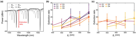 The extinction ratios for all resonator designs were measured, as described in Section 2.4, and the results are presented in Figure 8 and Table 3. This characterization was performed for five replicate chips and mean values are reported. Details regarding the number of resonance peaks included from each chip in each mean calculation are provided in Section S4, Table S1. As shown in Figure 8b, all C-band devices, excluding C3, exhibited maximum extinction ratios at their largest coupling gaps. Consequently, it cannot be concluded that critical coupling was achieved for these devices, and future work should include the fabrication of these resonators with larger coupling gaps to avoid over coupling. In SEM images, the measured coupling gaps were 20–40 nm smaller than designed, which may be related to proximity effect correction in the lithography process [102]. This may have contributed to this requirement for larger coupling gaps. As illustrated in Figure 8c, devices O1, O2 and O3 exhibited maximum extinction ratios at intermediate values of gc within their fabricated ranges. However, the variations in extinction ratio between different values of gc are similar in magnitude to the standard deviations of the measurements, so these results may not confirm critical coupling. Resonator O4 achieved an extinction ratio at its largest fabricated coupling gap, further highlighting that future work should extend the coupling gap ranges investigated here.