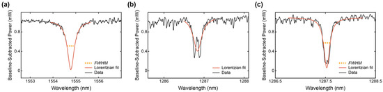 To extract the sensor performance criteria from the optical spectra, a custom semi-automated script was written in MATLAB (MathWorks, Natick, MA, USA). First, the user was presented with a plot of the overlaid optical spectra of the simultaneously measured 8 resonators and prompted to select the wavelength range to be analyzed. On each optical spectrum, the script then performed (1) peak-finding (findpeaks() function) to identify resonance peak positions and approximate peak widths, (2) fitting of the baseline (non-peak) regions of the spectra to a third-degree polynomial function (polyfit()) and subtraction of that baseline from the optical spectra, (3) linearization of the decibel-scale baseline-subtracted data, (4) nonlinear least-squares fitting of each resonance peak to a Lorentzian function (lorentzfit() 1.7.0.0 by Jered Wells on the MATLAB File Exchange). During step (1), peaks of interest were automatically distinguished from noise by setting the arguments passed to findpeaks() based on the expected form of the data. Specifically, the minimum peak prominence (height of the peak, or extinction ratio) was set to 2 dBm, and the minimum distance between neighboring peaks (FSR) was set to 2 nm. The script also plotted and saved figures highlighting the found peaks on the optical spectra so that the user could check for anomalous results during or after analysis. The fit was performed on the linearized, baseline-subtracted data, and the peak was inverted and normalized prior to Lorentzian fitting (the fitted peak was positive and extended from 0 to 1). If the goodness-of-fit was sufficiently high (R2 > 0.85), the center wavelength of the Lorentzian function was used as the resonance peak position in subsequent computations, and the peak’s FWHM was calculated from the Lorentzian fit. If the goodness-of-fit was insufficient, the raw peak location was used as the resonance peak position and the FWHM was not computed (the peak was not counted in subsequent quality factor analysis). The peak prominence from the peak-finding function was taken as each peak’s extinction ratio, the FSR was calculated as the average distance between the resonance peaks in the spectrum (and ng was computed from the FSR as [52]), and the quality factor was calculated from Equation (4) using the FWHM extracted from the Lorentzian fit.