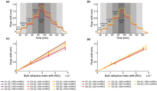 Bulk sensitivity measurements were performed by measuring the resonance wavelength shifts of the SWG MRRs during exposure to NaCl (Fisher Scientific S271-3, Thermo Fisher Scientific, Hampton, NH, USA) solutions with five different salt concentrations (0 M, 0.0625 M, 0.125 M, 0.250 M, and 0.375 M) and known refractive indices. The solutions were prepared using ultra-pure water. The refractive indices of the solutions were measured with an Abbe refractometer (Spectronic Instruments, Inc., Rochester, NY, USA). From lowest to highest concentration, the measured refractive indices of the solutions were 1.3335, 1.3341, 1.3346, 1.3360, and 1.3373. It should be noted, however, that these are visible wavelength refractive indices and do not account for chromatic dispersion.