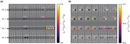 During the experiment, a custom Python acquisition script was used to sweep the tunable laser source over a 20 nm wavelength range (1540–1560 nm for the C-band devices and 1290–1310 nm for the O-band devices) and record the output transmission spectra from the photonic chip every 20–30 s. The fiber array alignment was monitored and adjusted every 30 sweeps using a fine align function to ensure good coupling to the on-chip grating couplers throughout the experiment.