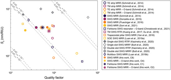 Accordingly, Sb and Q should be maximized for optimal sensor performance. Resonators designed with conventional strip waveguides (Figure 1c) operating in the quasi-transverse electric mode (hereafter referred to as the TE mode for brevity) can achieve very low optical losses, and therefore, high quality factors [33]. However, the high index contrast between the silicon waveguide and cladding material (typically aqueous solutions for biosensing applications) results in strong confinement of the electric field in the waveguide core. This results in little overlap between the evanescent field and analyte, limiting Sb [3]. Different waveguide designs have been investigated to achieve higher sensitivities, including thin strip waveguides [34], strip waveguides operating in the quasi-transverse magnetic (TM) mode (hereafter referred to as the TM mode for brevity) [21,35], and slot waveguides [36,37].