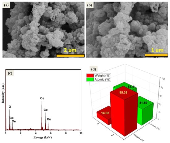 SEM images (a,b), EDX spectrum (c), and elemental composition (d) of the synthesized CeO2 NPs.