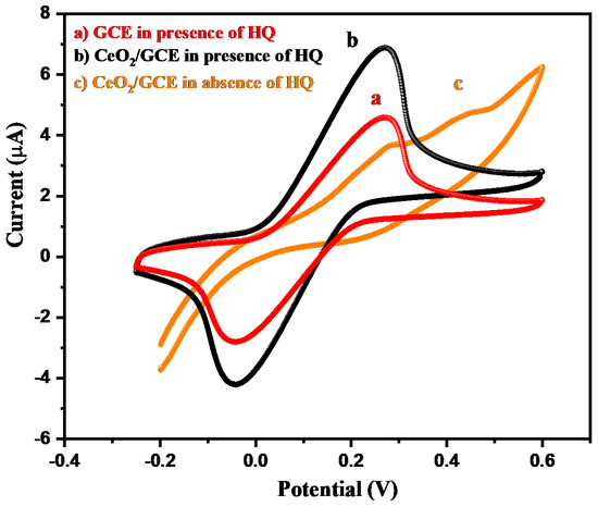 CV graph of GCE (a) and CeO2/GCE in presence (b) and absence (c) of 15 µM HQ in 0.1 M PBS of pH 7.0 (applied scan rate = 50 mV/s).