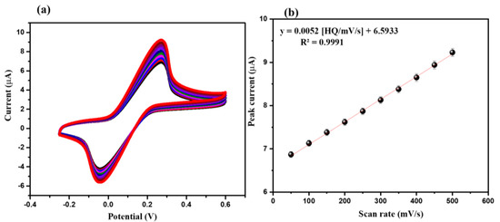 CVs (a) of CeO2/GCE in presence of 15 µM HQ in 0.1 M PBS (pH = 7.0) at different applied scan rates (50, 100, 150, 200, 250, 300, 350, 400, 450, and 500 mV/s). Calibration curve of peak current versus scan rate (b).