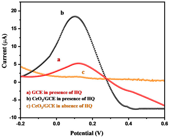 According to the recently published literature, it has been observed that differential pulse voltammetry (DPV) is a highly sensitive and efficient electrochemical sensing technique compared to the CV or linear sweep voltammetry. Thus, we have also applied the DPV technique to detect the HQ using CeO2/GCE as the electrochemical sensor. The DPV graph of the CeO2/GCE and bare GCE were obtained in the presence of 15 µM of HQ in 0.1 M PBS (pH = 7.0) at the applied scan rate of 50 mV/s. The collected DPV graphs of the CeO2/GCE and bare GCE have been displayed in Figure 7.