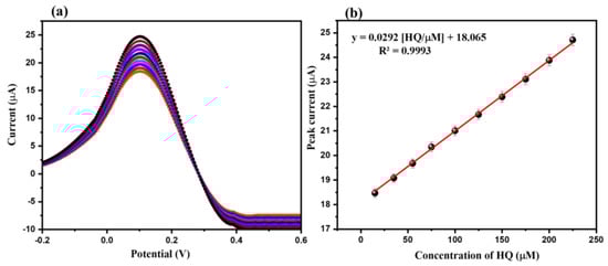 DPVs (a) of CeO2/GCE in presence of HQ (15, 35, 55, 75, 100, 125, 150, 175, 200, and 225 µM) in 0.1 M PBS (pH = 7.0) (applied scan rate = 50 mV/s). Calibration curve of peak current versus concentration (b).