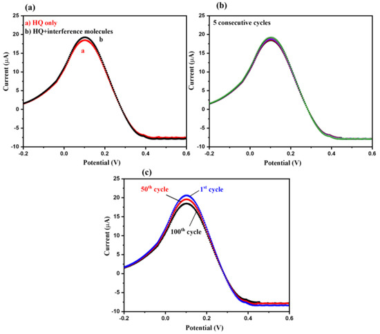 DPVs of CeO2/GCE. (a) Selectivity test: DPVs in presence of 15 µM HQ with (black) and without (red) interfering molecules (glucose, dopamine, H2O2, urea, uric acid, chlorophenol, nitrophenol, acetone, methanol, ascorbic acid, and hydrazine) at scan rate of 50 mV/s (concentration of interfering molecules was 5 times higher than that of HQ). (b) Repeatability test: 5 consecutive cycles of DPVs in presence of 15 µM HQ (scan rate = 50 mV/s). (c) Stability test: 1st, 50th, and 100th DPV cycle in 75 µM HQ (applied scan rate = 50 mV/s).