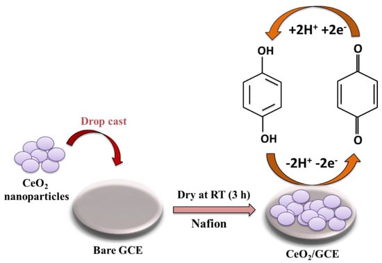 The bare GCE was cleaned with an alumina slurry (0.5 µm) and velvet pad. Further, 3.5 mg of CeO2 NPs was dispersed in 3 mL of DW (0.1 wt% Nafion) using ultrasonication for 1 h. The cleaned GCE (3 mm) was modified with 7.5 µL of CeO2 ink and dried at room temperature for 3 h (Scheme 2).