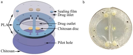 Structure of the microfluidic/chitosan device. (a) Three-dimensional exploded view of the device, from top to bottom: top PLA layer, drug reservoir, bottom PLA layer, and chitosan layer. (b) Photograph of the microfluidic/chitosan device.