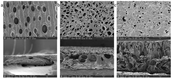 Images of chitosan discs using a scanning electron microscope (SEM). (a) SEM image of chitosan disc A, left for 2 h for dry phase separation. (b) SEM image of chitosan disc B, left for 1 h for dry phase separation. (c) SEM image of chitosan disc C, left for 0.5 h for dry phase separation.