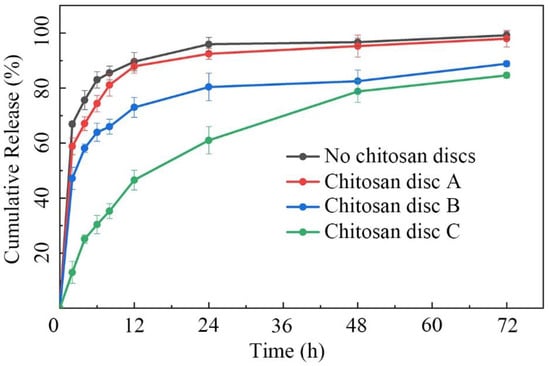 Cumulative release plot of minocycline in 72 h. The minocycline burst-released within 12 h in the microfluidic/chitosan device with no discs/disc A/disc B. The minocycline demonstrated sustained release over 48 h in the microfluidic/chitosan device with disc C. Error bars represent the standard deviation of the mean.