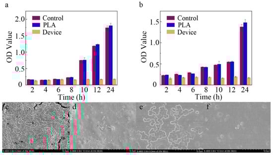 Characterization of antibacterial activity. (a) The OD value of E. coli after 24 h. (b) The OD value of S. mutans after 24 h. (c) SEM image of PLA substrate surface with E. coli. (d) SEM image of microfluidic/chitosan device surface with E. coli. (e) SEM image of PLA substrate surface with S. mutans. (f) SEM image of microfluidic/chitosan device surface with S. mutans.