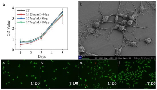 Figure 7a shows the CCK8 assay results of the fibroblasts seeded on the PLA surface of the microfluidic/chitosan device after 1–5 days. With the same initial seeding density, the OD values of the control and test groups were on a similar level on day 5. The blue line represents the minocycline condition that was same as the condition used in the bacterial test. Under this loading condition, bacterial proliferation was inhibited while the fibroblasts grew normally, which demonstrated the antibacterial and non-cytotoxic feature of the device. The red and green curves represent another two minocycline conditions with lower (0.125 mg/mL for solution and 80 μg for nanoparticles) and higher (0.75 mg/mL for solution and 160 μg for nanoparticles) minocycline loads, respectively. These similar proliferation curves showed a wide range for minocycline load and flexibility in the use of our device. As shown in the SEM results, the dense PLA layer could facilitate cell attachment (Figure 7b). The results of live/dead cell staining using the AO/EB kit are shown in Figure 7c–f. Both cells in the control and minocycline condition (0.25 mg/mL for solution and 80 μg for nanoparticles) spread normally over 5 days and demonstrated spindle morphology.