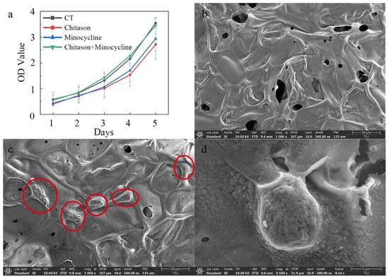 Characterization of osteogenic performance. (a) The OD value of the control and minocycline conditions across 5 days. (b) SEM image of chitosan substrate surface without osteoblasts. (c) SEM image of chitosan substrate surface with osteoblasts (30 μm scale). (d) SEM image of chitosan substrate surface with osteoblasts (5 μm scale).