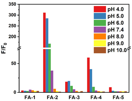 Systematic comparison of the response performance of five probes for FA sensing. Fluorescence intensity ratio (F/F0) of probes (FA−1–FA−5) before and after FA treatment in the pH range of 4−10; 5 μM probes were incubated with 2 mM FA in the experiment; For FA−1, data was collected at 442 and 530 nm correspondingly due to the ratiometric property of FA−1. For FA−2 and FA−3, data was collected at 530 nm. For FA−4 and FA−5, data was collected at 442 nm.