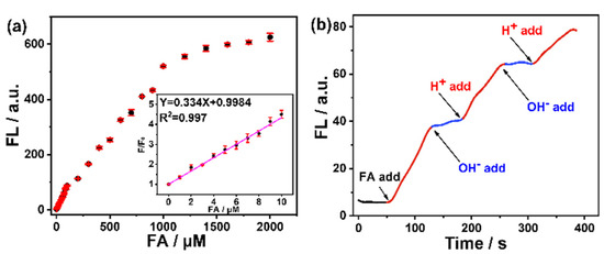 (a) Fluorescence titration of FA−2 toward different concentrations of FA (0–2000 μM) at 530 nm in PBS buffer (pH 5, 10 mM). Inset: the relationship between the fluorescence intensity and the concentration of FA in the range of 0–10 μM. (b) Real−time monitoring of fluorescent intensity changes of FA−2 (10 μM) toward FA (8 mM). The pH is switching between 5 and 7.4 by adding NaOH (1 mM) or HCl (1 mM) respectively. Ex: 380 nm, Em: 530 nm.