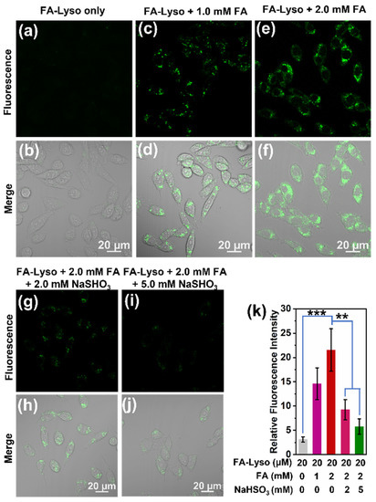 Confocal microscopy images of WI38 cells incubated with FA−Lyso and different concentrations of exogenous FA and NaHSO3. (a–f) Cells were incubated with FA−Lyso (20 μM) for 30 min and then treated with various concentrations of FA (0, 1, 2 mM) for 60 min. (g–j) Cells were incubated with FA−Lyso (20 μM) and NaSHO3 (2, 5 mM) for 30 min and then treated with FA (2 mM) for 60 min. (k) The relative fluorescence intensity of cells in Figure 4a–j. ** p < 0.01 *** p < 0.001 determined by Student’s t test.