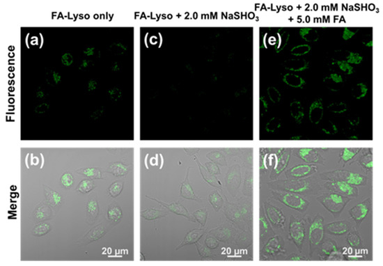 Encouraged by the above results, we further evaluated the capability of FA−Lyso to detect endogenous FA in living cells. We chose HeLa cells for our experiments as this cell line has been reported to overexpress FA [35,36]. First, with the addition of FA−Lyso alone, significantly enhanced fluorescence was observed (Figure 5a,b). However, when cells were pretreated with NaHSO3 and then incubated with FA−Lyso, the fluorescence intensity was dramatically decreased, indicating that FA in living cells has been depleted (Figure 5c,d). Subsequently, cells were sequentially preincubated with NaHSO3, FA, and FA−Lyso, the recovered fluorescence signal can be observed again (Figure 5e,f). Collectively, these studies demonstrate that FA−Lyso is capable of detecting endogenous FA fluctuation in living cells.
