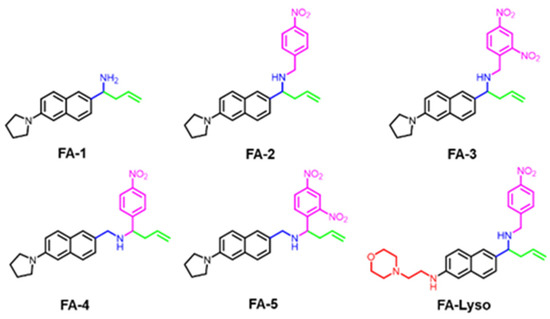 FA−1, FA−2, FA−3, FA−4, FA−5, and FA−Lyso were synthesized according to the route illustrated in Scheme S1 with satisfied reaction yields. Compounds A, B, C, and D were reported by our group or other research groups and synthesized as in the literature accordingly [24,28,29,30]. All the characterizations of products were performed by 1H NMR, 13C NMR, and ESI−MS and shown in Supplementary Materials.