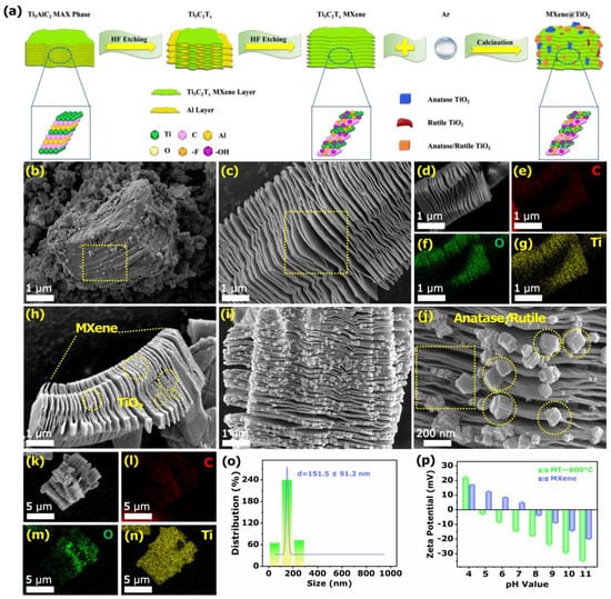 (a) Schematic illustration of the synthesis of MXene@TiO2 composites. SEM images of (b) Ti3AlC2, (c,d) MXene, and mappings of (e) C, (f) O, and (g) Ti elements. SEM images of (h–k) MT-600 °C, under different angles and mappings of (l) C, (m) O, and (n) Ti elements. (o) Particle size distribution histogram. (p) Zeta potential of MXene and MT-600°C with different pH value.