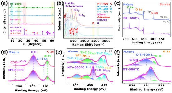 XRD patterns of (a) Ti3AlC2, MXene, MT-200 °C, MT-400 °C, MT-600 °C, MT-800 °C. (b) Raman spectra of MXene, MT-200 °C, MT-400 °C, MT-600 °C, MT-800 °C. XPS spectra of MXene and MT-600 °C: (c) survey, (d) C 1s, (e) O 1s, and (f) Ti 2p.