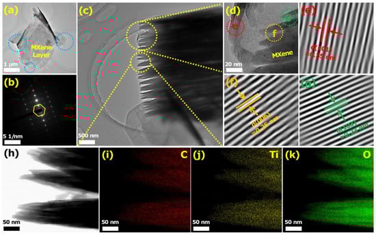 (a) TEM of MXene and (b) the corresponding SAED patterns. (c) TEM of MXene, (d) the corresponding HRTEM images, and the selected area (e–g) spacing images of (e) (101) plane, (f) (006) plane, and (g) (103) plane of MXene. (h) Bright-field scanning TEM image and EDX elemental mapping of the (i) C, (j) Ti, and (k) O.