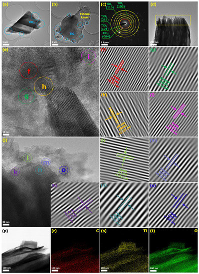 (a,b) TEM of MT-600 °C and (c) the corresponding SAED patterns. (d) TEM of MT-600 °C and the corresponding HRTEM images of (e–j). The spacing images of TiO2 (anatase, rutile) and MXene planes of HRTEM images of (e,j) with the selected areas (f–i) and (k–o), respectively. (p) Bright-field scanning TEM image and EDX elemental mapping of the (r) C, (s) O, and (t) Ti.