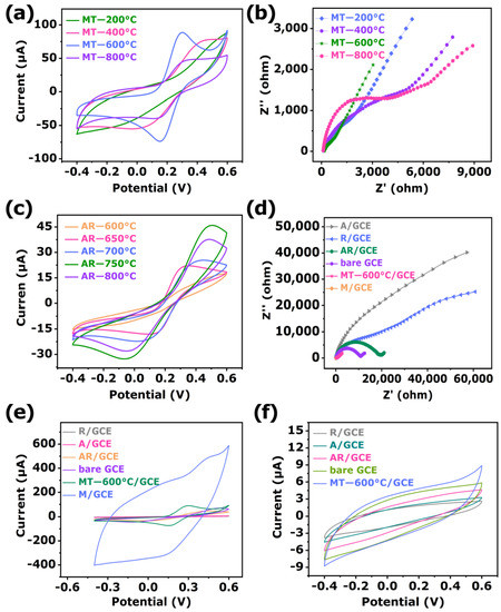 The EIS plots of different modified sensing materials are shown in Figure 5d. The Rct values of bare GCE, R/GCE, A/GCE, AR/GCE, M/GCE, and MT-600°C/GCE were estimated to be 10692, 39883, 31999, 19497, 35.5, and 465 Ω, respectively. Obviously, because of the high conductivity of MXene [63], the Rct of M/GCE was much smaller than that of other modified GCE. After the in situ growth of anatase/rutile TiO2 on MXene, the Rct of MT-600 °C/GCE became larger, compared with M/GCE. However, as a comparison experiment, AR/GCE had significantly lower Rct than A/GCE and R/GCE, but greater than that of MT-600 °C/GCE, which was caused by the formation of heterojunctions between MXene and anatase/rutile TiO2 to accelerate the charge transfer [64]. Interestingly, the Rct of the AR/GCE was significantly lower than that of the A/GCE and R/GCE, which could be attributed to the formation of heterojunction between the anatase and rutile from the anatase transformation. Moreover, the in situ growth of anatase/rutile TiO2 on MXene dramatically decreased the Rct of A/GCE, R/GCE, and AR/GCE, which illustrated that MXene improved the conductivity of the composite and facilitates the transfer of electrons. The construction of the modified electrodes was also studied by CV range from −0.4 to 0.6 V at a scan rate of 100 mV/s with 5 mM [Fe(CN)6]3−/4− solution containing 0.1 M KCl as the redox probe. As presented in Figure 5e and Figure S13, a pair of typical redox characteristic peaks appeared at bare GCE. After being modified with MXene on bare GCE, the redox peak currents increased remarkably, which depended on excellent electronic conductivity, excellent electrocatalytic activity, and a huge active area for MXene to accelerate the electron transfer [62]. However, the peak current decreased by modified MT-600 °C on bare GCE than M/GCE, which is ascribed to the poor conductive semiconductor material anatase/rutile TiO2 [65]. Nevertheless, the MT-600 °C/GCE peak current was obviously higher than that of A/GCE, R/GCE, and AR/GCE. The remarkable enhancement could be assigned to the synergistic effect of MXene and anatase/rutile TiO2. Additionally, it was found that the currents of A/GCE and R/GCE were significantly lower than that of AR/GCE, which was consistent with the EIS results.