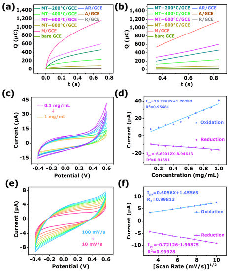 The electroactive specific surface areas of the bare GCE, A/GCE, R/GCE, AR/GCE, M/GCE, MT-200 °C/GCE, MT-400 °C/GCE, MT-600 °C/GCE, and MT-800 °C/GCE were investigated via chronocoulometry (Figure 6a,b and Figure S15a,b) and calculated by Anson Equation (1) [66]:
