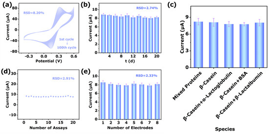 The repeatability was studied by using one MT-600 °C/GCE under the same conditions, which were employed to measure the responding current of 1 mg/mL β-Casein 20 times successively (Figure 7d). The RSD was 2.91%, which displayed the approvable repeatability.