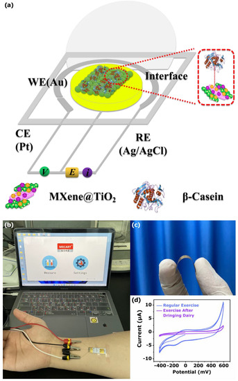 Ti3AlC2 (98.0%), hydrofluoric acid (HF, 99.0%), potassium ferricyanide (K3[Fe(CN)6], 99.5%), potassium ferrocyanide (K4[Fe(CN)6], 98.0%), potassium chloride (KCl, 99.5%), titanium dioxide (TiO2, rutile, anatase), bovine serum albumin (BSA), Nafion 117 solution (5%), β-Casein, α-lactalbumin, and β-lactoglobulin were purchased from Aladdin (Shanghai, China). Absolute ethanol was purchased from Sinopharm Chemical Reagent Co. (Shanghai, China). Artificial sweat was purchased from Dongguan Xinheng Technology (pH = 5.0, 6.0, 7.0, 8.0, and 9.0, Guangdong, China). All chemical reagents were analytical-grade and directly used without further refinement.
