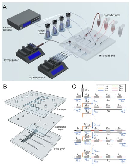 The microfluidic system for dynamic generation of concentration profiles in four parallel channels. (A) The schematic of the experimental platform consisting of a pressure controller, two syringe pumps, and a microfluidic. (B) The explosion view of the device with the gas, membrane, and fluid layers. (C) An equivalent circuit of the chip with n branch channels.