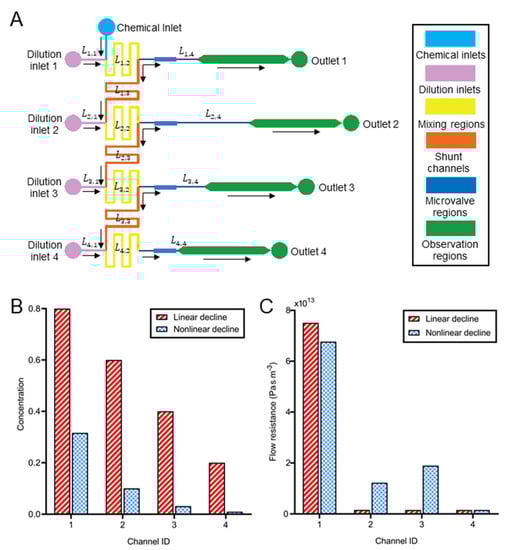 The flow resistance in the first channel was significantly higher than the others. For example, to acquire a linearly declining concentration, the flow resistance in the first channel was 75.1 × 1012 Pa·s/m3, which was 48.14 to 48.77 times that in the rest three channels. Otherwise, most liquid might be directed to the first observation channel owing to the flow resistance distribution of the whole chip. Similarly, for the nonlinear concentration decline, the flow resistance in the first channels was 3.58 to 43.68 times that in the other channels. Moreover, the flow resistance in the second and third channels was 7.87 and 12.19 times bigger than in the last channel.