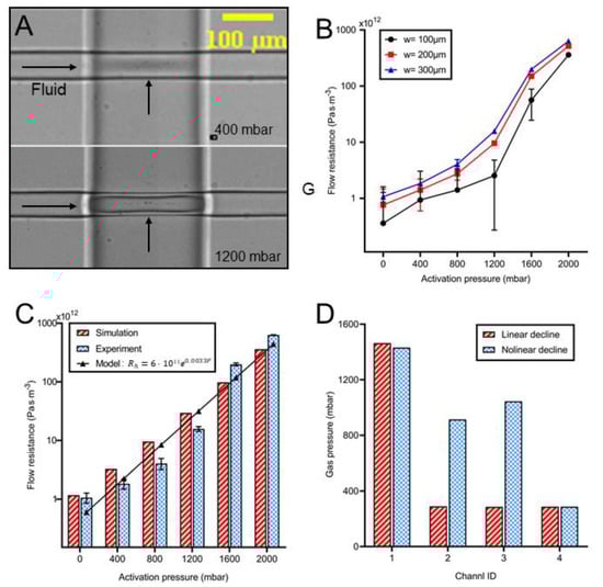 The flow resistance in a 300 µm valve acquired by either simulation or experiment was further compared in Figure 4C. Resistance from both methods had a difference of less than 57% for low activation pressure, whereas large errors (102% and 75%) occurred when 1600 and 2000 mbar were applied. This error may be related to the expansion of the gas channel, which has not been considered in the simulation. Since the walls of the gas channel were also formed by elastic PDMS, they may have a deformation under the pressure. Similar to the big wall collapse (8.6 μm for 2000 mbar) on the liquid channel (Figure 3A), there was a horizontal collapse on the gas channel, which was already observable under 1200 mbar pressure (Figure 4A). The pneumatic expansion of the gas channel under high pressure (more than 1200 mbar) prolonged the valve width, which significantly improved the experimental value of the flow resistance. An empirical model (R2 = 0.86) was fitted to describe the relationship (Equation (7)) between the flow resistance () and the activation pressure (P):
