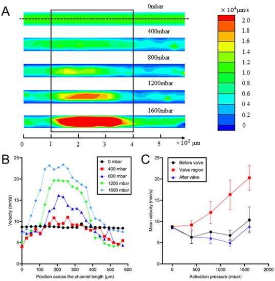 Micro-PIV was employed to measure the velocity under the 300 μm-width valve on the device mentioned in Section 3.3 and analyze the influence of the deformed membrane on flow resistance. When no pressure was applied to the valve, the velocity was uniform along the whole channel (see Figure 5A top). Nevertheless, there was a high-speed region under the membrane as the activation pressure on the valve increased from 400 to 1600 mbar (see Figure 5A), which was caused by the parabolic profile of the cross-sectional area (see Figure 3A). In addition, high-velocity regions expanded at higher activation pressure values, indicating a flatter membrane surface under higher pressure.
