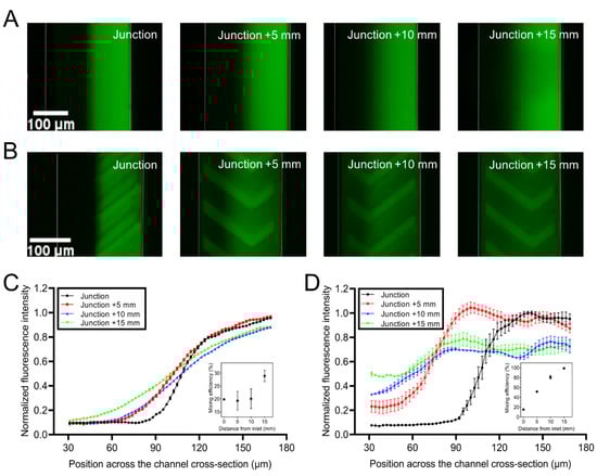 To increase the throughput of mixed liquid, a higher inlet flow rate was required. However, at a high flow rate, the fluorescein was hardly mixed in the observation region, since the pure diffusion-based mixing required much longer channels. Therefore, herringbone structures were used to enhance mixing at a high inlet flow rate. In Figure 6A, the clear dark region in the vicinity of the fluorescence suggested uneven mixing between the dye and water at 15 mm away from the water-fluorescence junction when herringbone structures were absent. In contrast, the dye in the channel with herringbone structures was mixed only 5 mm away from the junction (Figure 6B), suggesting the efficiency of herringbone structures in mixing both liquids. The mixing characterization of the herringbone structures was analyzed quantitatively by measuring fluorescence intensity in the microchannel. In particular, the mixing efficiency (insets in Figure 6C,D) was calculated by dividing the mean intensity of the region from position 30 to 60 μm by 0.5. Figure 6C,D showed the fluorescence intensity on the lines (across the channel) 0, 5, 10 and 15 mm away from the merging point of the DI water and fluorescein in devices either with or without herringbone structures. In devices without herringbones (Figure 6C) there was only a 28.9% mixing after flowing for 15 mm. However, in devices with herringbone structures, the mixing efficiency reached 51.6% after 5 mm flowing and achieved 99.0% at the position 15 mm away from the mixing junction (see Figure 6D). The results indicated that the herringbone structures well enhanced the mixing in microchannel.