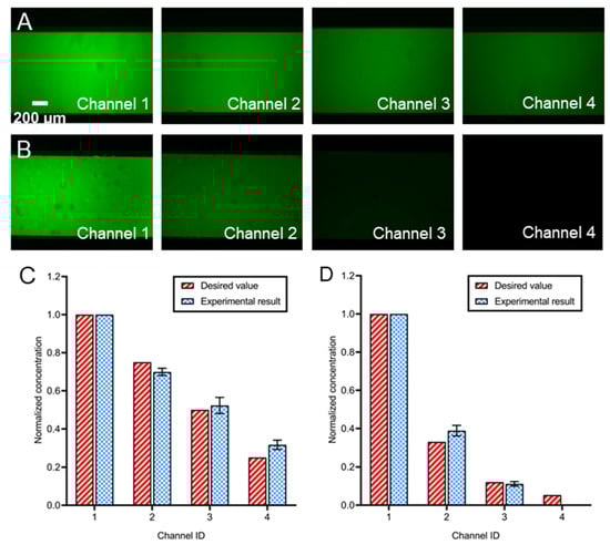 The device’s capabilities in generating dynamically varying concentrations were validated by creating both linear ( = −0.2k + 1) and nonlinear decline ( = ) concentration profiles. Figure 7A and B showed the fluorescent images of four observation zones 2 min after the activation of four valves (see Table S3 for the pressure combinations). The uniform fluorescence intensity demonstrated thorough and quick mixing since the images were taken only 2 min after valve activation. When the valve states combinations were swapped, the normalized concentration in four channels quickly varied between linear and nonlinear decline as shown in Figure 7C,D. Moreover, there was less than 26.6% difference in the normalized concentration acquired between the experiment and the desired value for both the nonlinear and the linear cases, except no signal was detected in Channel 4 for nonlinear profile, which may be because of the excitation limitation of the dye. The errors might be related to manufacturing accuracy or flow resistance calculation, as some structures such as herringbone parts were ignored in the calculation.