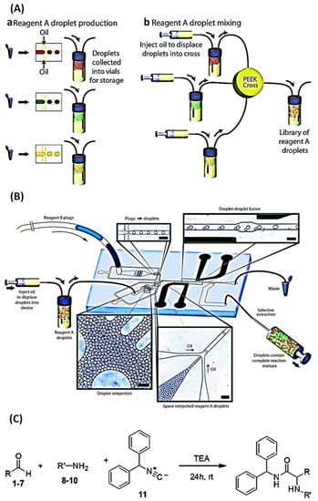 In fact, there are many ways to generate droplets, such as valves, CNC, electric fields, magnetic fields, acoustic waves, syringe pumps, and gravity. It is entirely possible to produce suitable droplets in different ways according to the required requirements [36]. Microfluidic droplet microreactors offer numerous benefits, such as replacing tedious biochemical laboratory operations, reducing the reaction generating area, performing high flux reactions, efficient conduction, stabilizing the product quality, and synchronizing the reaction time. The in situ reaction is a popular method of droplet chemical synthesis: all reactants are synthesized into droplets before the reaction [26]. Sarah L. Poe et al. invented a method for droplet collision diffusion using microfluidic chips. The principle of droplet collision is that none of the disperse-phase reagents can be mixed with the carrier phase, so the reagents are mixed in the tube by droplet collision. These droplets can then be used as separate reactors for chemical reactions, and the reaction products are confined in these droplets. Therefore, after the reaction occurs, the product will be far away from the tube wall, and the purpose of avoiding the deposition of reaction products in the microfluidic device will be achieved. It was found experimentally that small droplets centered in the oil tube were produced in this device when the carrier phase was mineral oil and the flow rate was 3 mL/min. They used the indigo synthesis reaction to verify the effectiveness of this anti-sink design due to the precipitation and color change that occurs with the indigo synthesis reaction. The results demonstrate that the use of mineral oil as a carrier at a flow rate of 3 mL/min can achieve anti-deposition [37]. Another form of trigger synthesis exists in which the reaction can begin at a predetermined moment. As an example, a closed droplet microfluidic chip capable of immobilizing compounds was studied using PDMS as the material. The Ugi-type reactions of amines (A1–A3) and aldehydes (B1–B7) with isocyanide were carried out on this chip. Small molecules that can inhibit thrombin were synthesized, as shown in Figure 2. A monodisperse droplet in a droplet microfluid acts as a standalone microreactor that can perform a diverse range of reactions in tailored environments. Regardless of the reaction mode used, it allows for universal reagent selection and minimal specimen depletion [38].