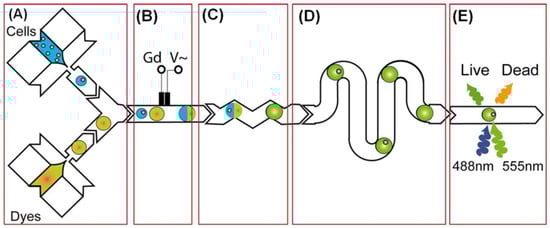 Schematic diagram of drug screening by Droplet Microfluidic Chip: (A) Inject droplets containing cells and fluorescent dye. (B) Droplet merging is controlled by electricity. (C) Mixing dyes with cells. (D) Optimize cell staining by extending channels. (E) Collect fluorescent signals. The image from [46], Copyright 2009, PNAS.