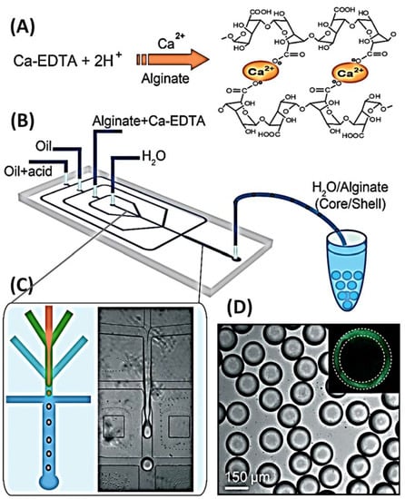 Schematic diagram of the creation of a three-dimensional scaffold in a droplet (composed of a water nucleus and a hydrogel shell): (A) Principle of obtaining alginate networks. (B) PDMS Microfluidic chip. (C) Alginate cross-linking in the Microfluidic chip. (D) Fluorescein-labeled alginate as shown in the inset where the shell of alginate hydrogel was found under confocal microscopy. The image from [48], Copyright 2016, Royal Society of Chemistry.