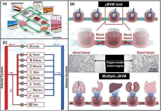 Schematic of a human on a microfluidic chip: (A) An integrated system composed of micro-organs. The image from [51], Copyright 2011, Elsevier. (B) Integrated system of multiple culture dishes connected by perfusable vessels. The image from [52], Copyright 2015, SAGE. (C) Integrated system of different organ-on-a-chip couplings. The image from [53], Royal Society of Chemistry.