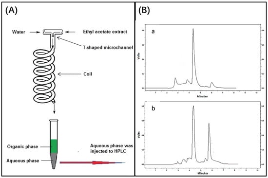 In 2018, Rouhollah Heydarid et al. attempted to extract olive bitter glycosides from organic extracts of olive leaves into the aqueous phase using microfluidic chip technology (Figure 9). Olive bitter glycosides occupy an important position in medicine and can be used as antibiotics, antimalarial agents, antioxidants, and in the prevention of Alzheimer’s disease. However, the current process of extracting olive bitter glycosides from resins is complex, time consuming, and expensive, making this study of great importance. In this experiment, a syringe pump served as the driving force; the ethyl acetate extract and the aqueous phase entered two separate inlets; a t-shaped microchannel served as the mixing chamber; a coil was provided at the outlet to increase the contact time between the two phases; at the outlet, the two phases were separated because of the difference in density (bottom: aqueous phase and top: ethyl acetate); and the concentration of the two phases of olivetin was determined using a high-performance liquid chromatography (HPLC) system. The principle of the microfluidic device for the extraction of olive bitter glycosides into the aqueous phase using a microfluidic device and ethyl acetate extract is shown in Figure 9A, and a typical chromatogram is shown in Figure 9B [5]. However, two-phase laminar flow microfluidics has an insufficient interface area when compared to three-phase laminar flow microfluidics, which can provide twice the interface area. Under the same conditions, the separation capacity of two-phase microfluidic chips is inferior to that of three-phase layer microfluidic chips [9]. This finding was demonstrated through experiments including the extraction of alkaloids (strychnine and brucine) from plants and two groups of non-polar and polar components with differing clinical effects from Salvia miltiorrhiza [8,9]. Taking advantage of the potential benefits of “simultaneous extraction and reverse extraction”, the three-phase chip was developed for the efficient and rapid purification of analytes of interest from drugs and plant extracts at low flow rates.