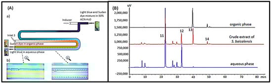 Separation and purification can be improved by combining microfluidics with LLE or induced phase separation extraction (IPSE). IPSE is a modification of LLE, in which organic solvents are separated from water in seconds through the addition of salt or hydrophobic solvents or cooling of the solution to a temperature below zero. Ideally, the components can move quickly to more affinity solvents due to differences in substance properties. By using the separation principle of IPSE, a solution containing the target product can be obtained quickly. However, there is still a need for automation due to the complex operation of IPSE, and microfluidics can help reduce the complexity of the operation. For example, a valuable experiment was conducted in 2021 to develop an IPSE chip using microfluidic technology. The addition of a hydrophobic inducer resulted in the separation of the sample solution of acetonitrile–water into separate organic and aqueous phases. The adjustment in the acid/base properties of the sample solution affects the distribution of the compounds. In this experiment, aglycones and glycosides were successfully separated from Scutellaria baicalensis extract, as shown in Figure 11. Sample and solvent usage were whittled down. The sample pretreatment time was shortened, the extraction efficiency was higher than that of the LLE chip, and the formation of emulsions was prevented. More importantly, the operation is far less tedious compared to macro-LLE or IPSE [10].