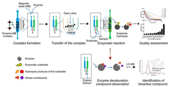 Ling Lin et al. developed a microfluidic system for the extraction and detection of catechins from green tea by combining solid-phase microextraction and chemiluminescence. Specifically, it is divided into two steps. Firstly, the monolithic column is integrated into the microfluidic chip to achieve the extraction of catechins from green tea. Then, the catechins react with potassium permanganate to produce chemiluminescence. The reason for using the monolithic column as the extraction material is its good permeability, convenience, and enrichment, while the use of microfluidics enables the automation, integration, and miniaturization of the analysis, which has tremendous benefits in terms of reduced reagent usage and time reduction. Finally, since the reaction of catechins with potassium permanganate can produce chemiluminescence directly, additional manipulation and the influence of external light sources can be avoided, and the effects caused by stray light and light source fluctuations can be excluded. In their analysis, the linear range was 5.0 × 10 −9–1.0 × 10 −6 M, and the limit of detection was 1.0 × 10 −9 M; the recoveries were able to reach 90%–110%; in addition, the relative standard deviation (RSD) was found to be 4.8% by parallel measurement of 10 samples with 1.0 × 10−8 M catechins. These data show that the system has satisfactory linearity, sensitivity, recovery, and precision. The system eliminated the tedious elution step and had high sensitivity, low consumption, and reusability, thus being an inexpensive and high productivity means of testing the quality of green tea [61]. Often, the therapeutic activity of conventional medicine is due to the synergistic and simultaneous action of several chemicals; therefore, confirming only the content of a single ingredient may not be realistic [1]. Since the determination of single chemical composition is not sufficient, the determination of multiple chemical compositions may be one of the favorable methods for increasing the convincing power. Attempts to control the quality of drugs by testing multiple ingredients were made more than a decade ago. A flow injection (FI)-microfluidic capillary electrophoresis (CE) microfluidic chip, suitable for the determination of the main components in pharmaceutical preparations, was proposed in 2003. This experiment determined the content of four alkaloids (ALP, SRI, MT and OMT) in two marketed drugs and proved the efficiency, reproducibility, and applicability of the FI-CE microfluidic chip. It is a promising method for both drug quality control and routine analysis and monitoring [62]. In addition, Tsung-Ting Shih et al. combined microfluidic electrophoresis and electrochemical detection with a simple derivatization method for the determination of five representative components of hesperidin, including Pinellia ternata guanosine, methionine, glycine, 3,4-dihydroxybenzaldehyde, and homogentisic acid. The improved efficiency and reduced sample and reagent consumption provided a promising idea for the efficient analysis of complex components [63]. Additionally, in 2017, Mad et al. provided an interesting experimental design for the completed biological pharmaceuticals, as shown in Figure 12. Ahmad et al. evaluated the quality of QiShenYiQi pills (QSYQ) using microfluorescence and assessed the biological consistency by enzyme inhibition of thrombin and angiotensin-converting enzyme (ACE) as quality biomarkers. QSYQ is a pharmaceutical product containing plants such as Astragalus, Salvia, Panax ginseng, and Dalbergia odorifera. The complexity of the constituents led to the undesirability of the strategy of quality assessment based on the presence or absence of one or several molecules within the drug. They innovated the approach of judging the effectiveness of pharmaceuticals based on the changes in the biomarkers. Three functions, namely, enzyme–MB complex formation, and enzyme reaction and screening, were combined in a multifunctional chip. Then, enzyme inhibition (percentage) was used as an indicator of drug quality; and the HPLC system combined with a variable wavelength detector (VWD) was used for a fingerprint analysis. After studying five batches of QSYQ, differences in the effects on thrombin and ACE were found between batches, demonstrating the validity of the method. More positively, they further explored the linearity, reproducibility, and reliability of this strategy. The results showed an r2 of 0.9988 and a repeatability of less than 15% for thrombin; and an r2 of 0.9810 and a repeatability of the same less than 15% for ACE. The reliability of the strategy was then demonstrated by using AEBSF-HCl and captopril as positive controls, measuring their IC50, and comparing them with literature data. Moreover, in this study, not only the quality assessment was achieved, but also tthe discovery of molecules that actually have a real therapeutic effect. Tannins, B hydrochloride, tannic acid C, and rosmarinic acid showed potent inhibition of thrombin, while tannins inhibited ACE [2].