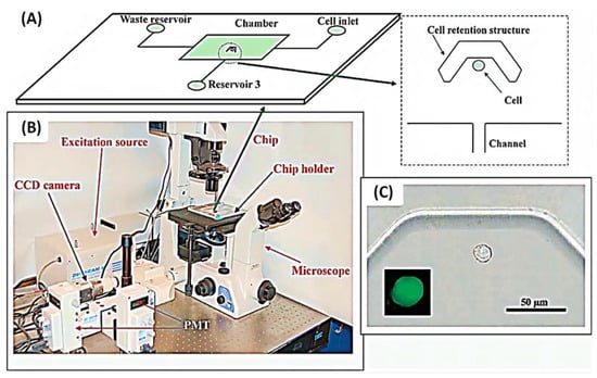 Long Pang et al. created an integrated microfluidic device that can capture single cells based on their biomechanical characteristics (size and deformability) and analyze their drug resistance, as shown in Figure 3 [39]. Brouzes et al. developed a droplet viability assay that allows for the quantitative scoring of cell viability and proliferation within intact droplets, enabling the screening of cytotoxic effects of the entire drug library on the cells, as shown in Figure 4 [15,46]. Shinji Sugiura et al. described a pressure-driven perfusion culture chip for parallel drug cytotoxicity assays. The device comprised an 8 × 5 array of microchambers for cell culture with independent perfusion microchannels, permitting uniform cell loading and perfusion culture without cross-contamination between adjacent microchambers. They evaluate the cytotoxic effects of seven therapeutic drugs in parallel using this microfluidic chip. The capability of the chip to easily eliminate air bubbles, inject uniformly, and quantify cell proliferation makes it an efficient method for screening potential drug candidates (Figure 5) [42].