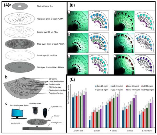 (Aa) Structural view of the Microfluidic compact disc (CD). (Ab) Top view of the third layer of the antioxidant microfluidic chip. (Ac) The whole experimental setup. (B) Image and schematic diagram of the whole process on CD. (Ba) Initial of the experiment, speed is 0. (Bb) The plant extract starts to flow into the capillary valve, speed increases from 0 to 300 rpm. (Bc) The plant extract chamber is emptied, speed 300 rpm. (Bd) The DPPH solution flows from its reaction chamber to the capillary valve, speed increases slowly from 300 to 800 rpm. (Be) The DPPH reaction chamber is emptied, speed 800 rpm. (Bf) All solutions were properly mixed in the reaction chamber at a speed of 1400 rpm. (C) Comparison of the conventional and LoD methods at different antioxidant activities. The image from [67], Copyright 2018, MDPI.