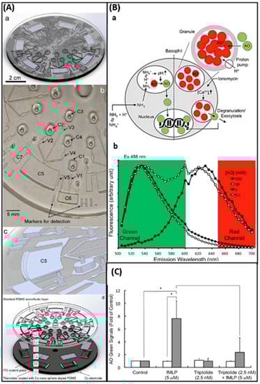 (Aa) Schematic diagram of the LOAD layout. (Ab) Chambers, channels, valves and siphons for testing allergenicity in one unit. (Ac) A zoom-in diagram showing the flange in C5. (Ad) Assembly of the integrated microfluidic layer. (Ba) Schematic diagram of AO as a degranulation reporter. (Bb) Red-shift phenomenon. (C) Triptolide suppressed the fMLP-mediated AO release in KU-812 cell. The image from [68], Copyright 2016, MDPI.